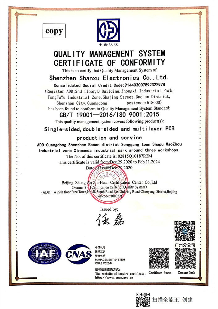 Shanxu aims to provide our customers with the highest quality printed circuit boards at the most competitive pricing. We deal with all orders in heart no matter whether you order is prototype or mass production. We manufacture PCB based on IPC guidelines and complies with ISO9001:2015 and RoHS/REACH standards.